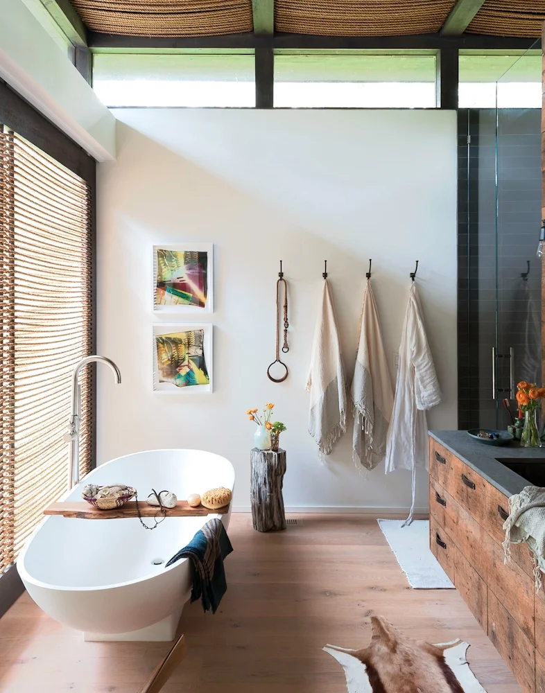 I love the juxtaposition of the modern bathtub beside the rustic tree stump table.